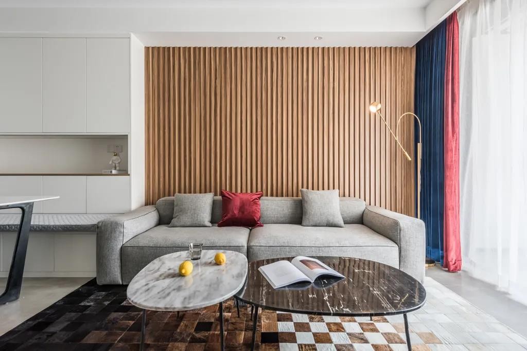 沙发墙加入长城板的背景墙,布置灰色布艺沙发,还有黑白配的大理石茶几,在红蓝配的窗帘烘托下,整个空间显得现代时尚。