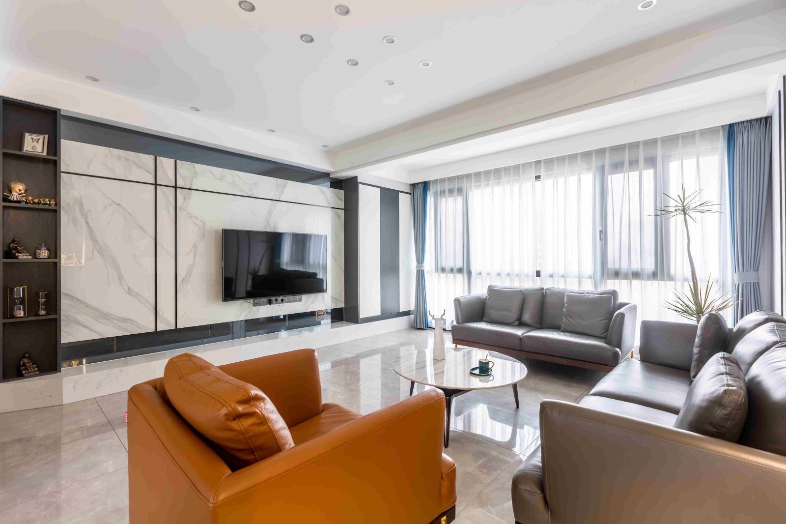 客厅以简洁的淡灰色墙面空间,电视墙是一个定制的电视柜组合设计,左侧展示架旁边还有四块隔板架,摆上小饰品与绿植,让空间显得精致而清新舒适。
