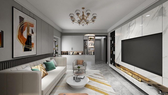 客厅选用质感舒适的集成墙咔作为装饰,电视墙加以电子壁炉装饰,边柜加入适量的储物空间。