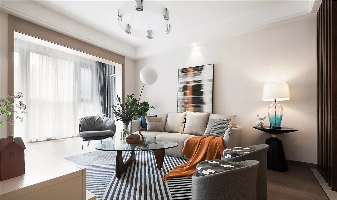 客厅以轻柔的浅色系为基调,辅以深蓝、清水蓝、橘红色等跳跃性色彩,大胆而灵活,为屋主编织了一室温馨放松的格调。