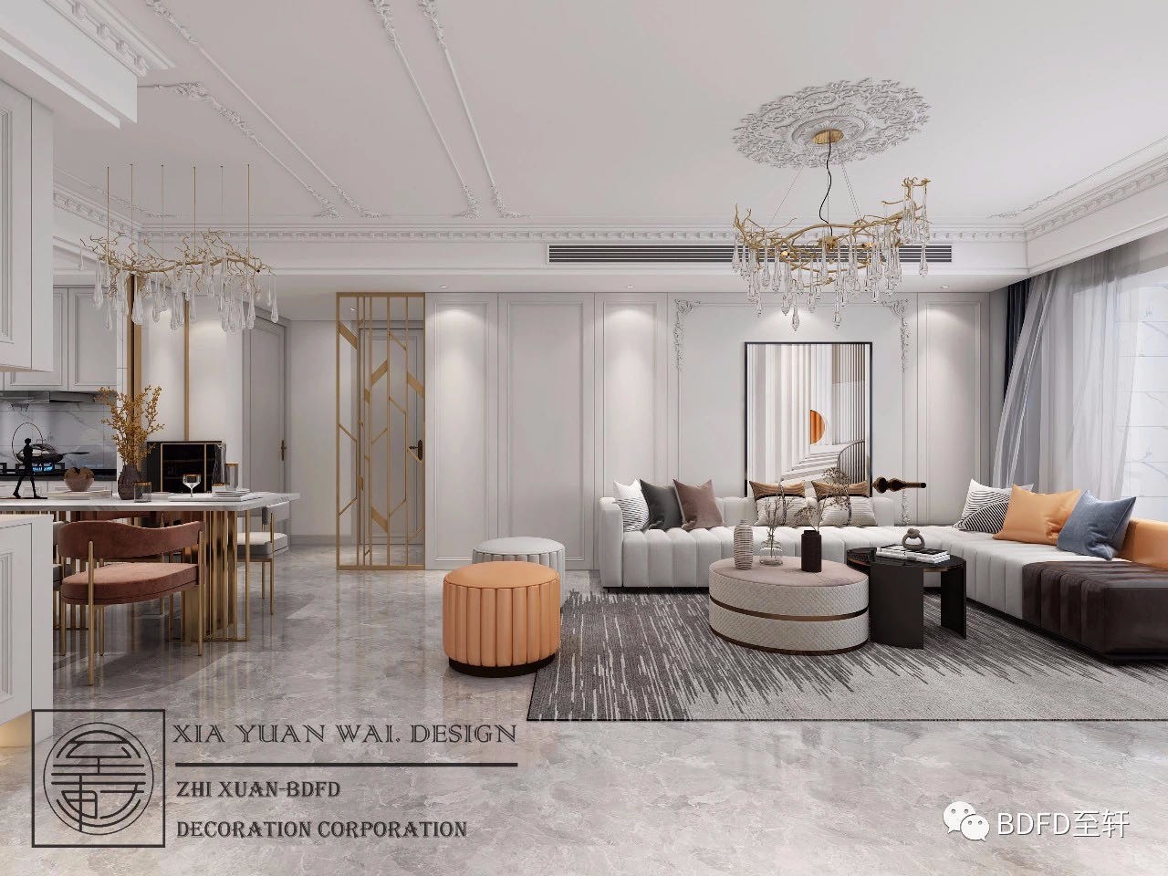 客厅色彩搭配,采用大面积白色底色,结合现代古典,用古典绞花线条勾勒空间,完美搭配