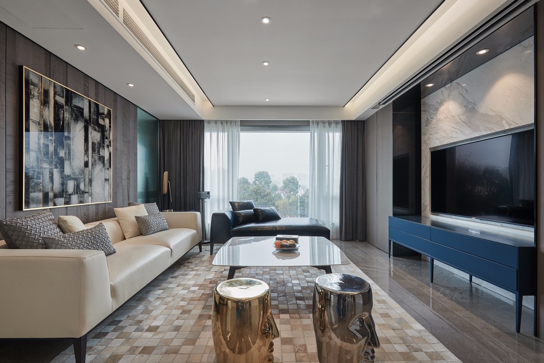 整个客厅主体黑白灰色调,配以暖色调家具,冷暖对比,相得益彰