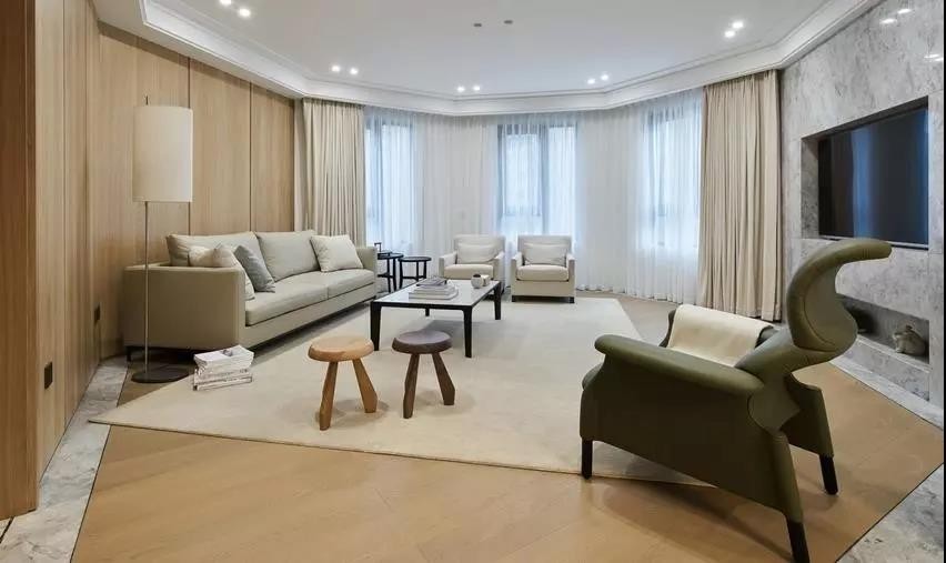 采用浅色为主的设计,用沙发墨绿色单个沙发点坠