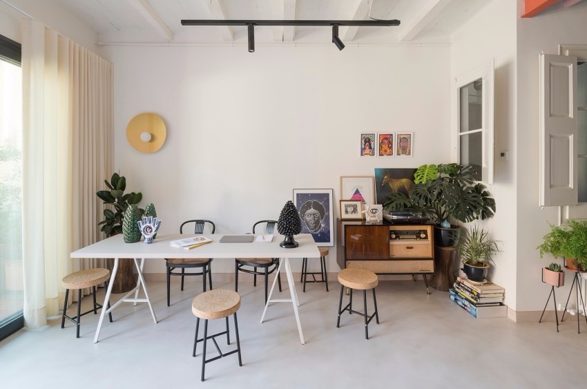 从艺术花砖玄关至卧房处,镶入如L型半拱形湖水蓝落地壁柜,开起拉门即可瞧见粉橘卫浴隐藏于其内,藉由蓝橘撞色反差衬出视觉亮点,同时展现灵巧收纳,开放式客厅由亮橘横梁、粉嫩***管线向外拓展,辅以可俯瞰街区的日光露台,敞开明亮视野,并随性点缀温馨米灰沙发、古董家具、艺术挂画,塑造独特迷人的品味