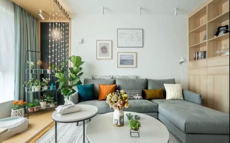 玄关柜一直延续到客厅区域,沙发侧面的柜子上半部分做为书架,中间做了抽屉放些小物品, 下半部分做为客厅大件物品储存区。长度2.6m的沙发,L型设计,可躺可卧很方便