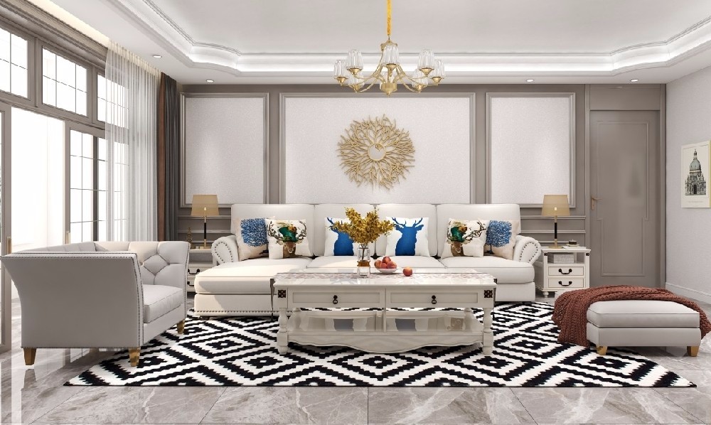 客厅采用了美式轻奢的设计风格。白色系与灰色系的撞色搭配,加上软装搭配。让原本普通的家,看上去更加奢华,高贵