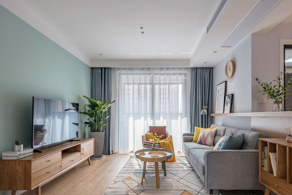 整体采用明度高、低饱和的色彩组合,同时强调简洁、明晰的线条,营造明快开阔的居家氛围。