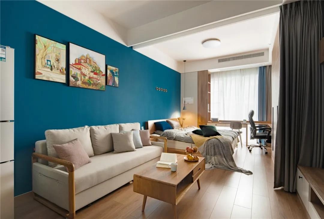 卧室与客厅的隔断并未采用玻璃移门等形式,而是选用一副灰色窗帘作为软隔断,更加节省空间。