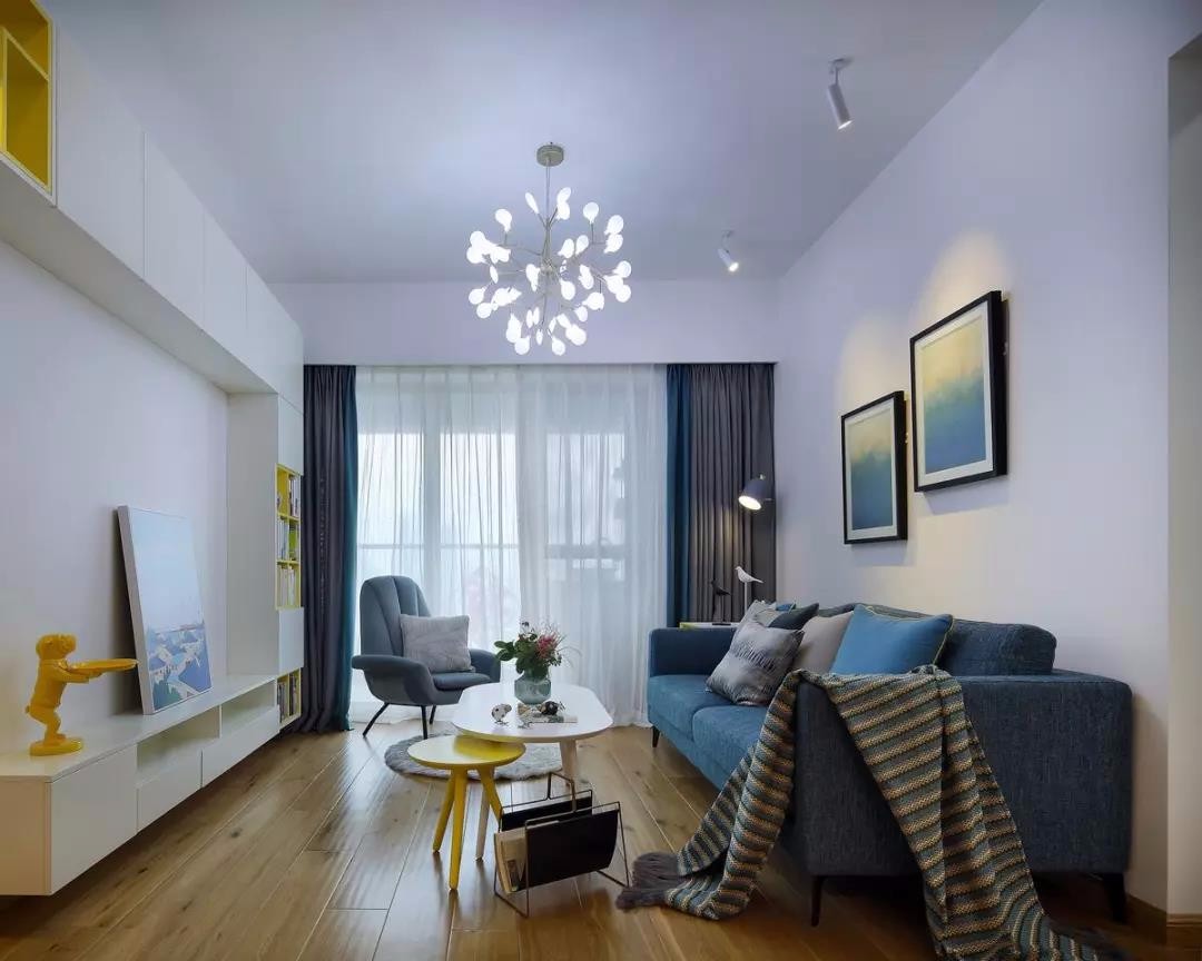 整个客厅的配色比较多样化,但又不会让人感觉繁杂,蓝色的布艺沙发和灰色、蓝色的窗帘相互呼应,客厅空间虽然不大,但***致。