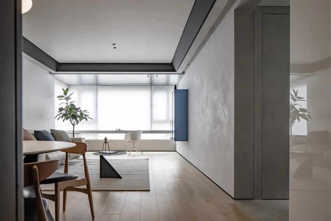 客餐厅一体式设计,厨房外的公共区域通铺木地板,与黑色储物柜相称,精简设计更需要注意细节。