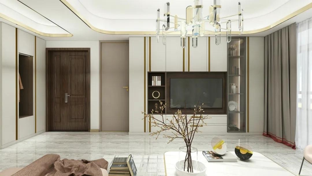 客厅大量使用金属色,精致奢华感油然而生。白色和粉色的休闲沙发,触感柔软有弹性、给予空间甜美、柔和的氛围,让人回到家就可以放下一切戒备,完全放松。