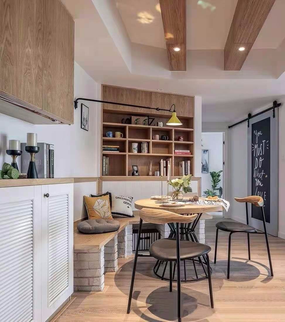 户的玄关走廊和餐厅连在了一起,餐厅根据折角做了卡座,卡座的边上就是鞋柜,文化砖搭配木板的卡座显得很有艺术感。