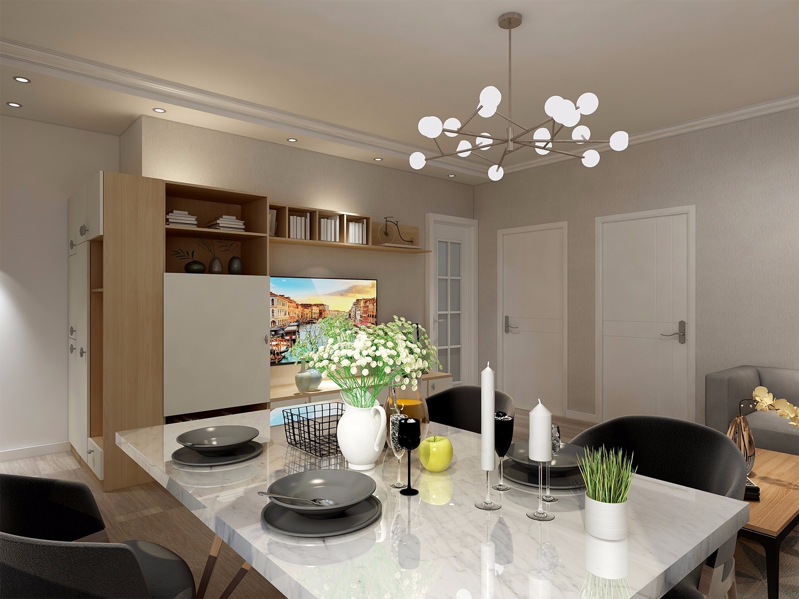客厅餐厅空间吊顶都是极为简单的收边,为处理墙纸和顶部的关系灯具也十分舒适和简单,白色留边的顶部也为空间多了一个层次,所有顶面保持原有的空间高度,让客餐厅的高度感觉十分舒适。