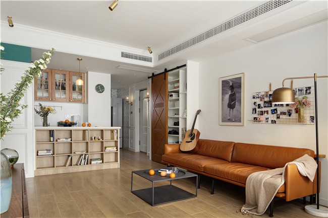 客厅的设计舒服又温馨,在靠窗区增加了餐桌,飘窗改造为一排卡座,既可用来当就餐时的座位,又可当做休闲时的区域,一物多用。沙发选用皮质的爱马仕橙,和一侧的金属落地灯,又打造了满满的轻奢氛围。