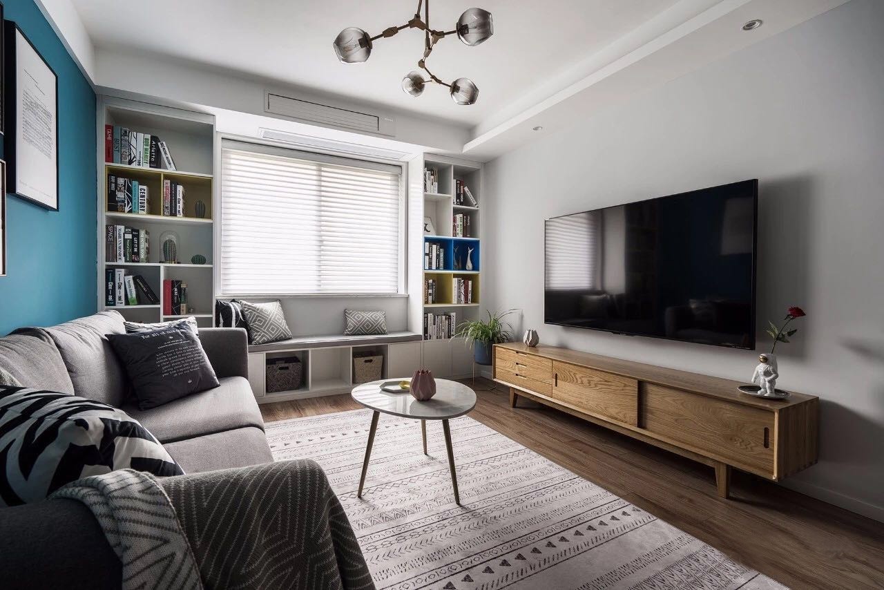 摒弃大白墙,采用湖蓝色做为沙发背景,灰色布艺沙发,地面整体木地板,原木色的家居,电视墙浅灰色, 呈现北欧风格的格调,略显文艺气息