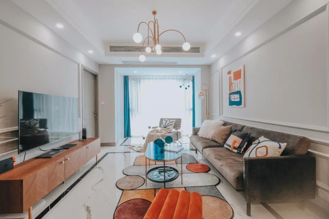 客厅的电视墙与沙发背景墙用石膏线做了简单的造型,弧形吊灯和透明玻璃茶几让整个空间显得非常轻盈。