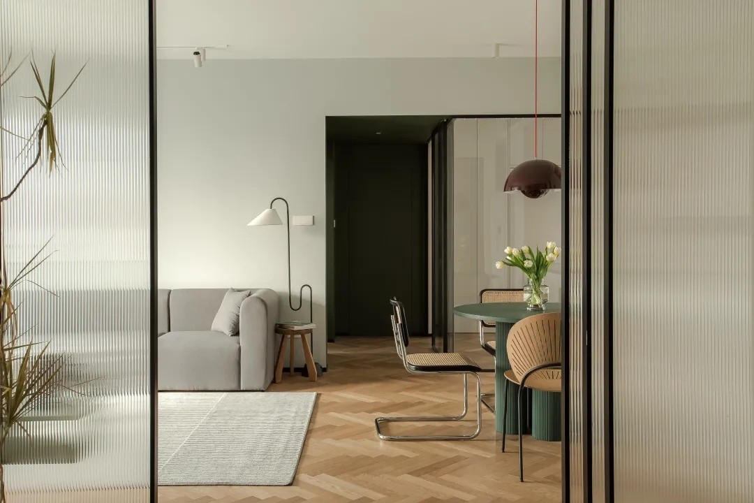 客餐厅空间采用杏灰色与豆蔻青作为空间的基调,加上橡木色“人字铺”地板,,将功能与美感结合便能成就简约的日常美景。
