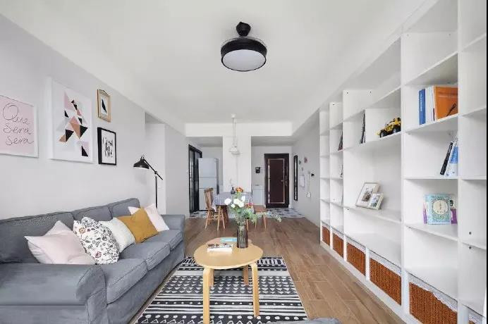 客厅这边几乎不做吊顶,连主灯都是用的最简单的款式,这样显得空间更高更宽敞,避免了小户型因为层高低矮带来的压抑。电视墙是齐家小菜最满意的地方了,靠墙定制了一整面的柜子,可以放很多书籍、摆件之类的,既能展示又能收纳,中间的位置刚好可以放电视,目前电视没有到,所以放了装饰画填补空缺,而柜子***部的收纳篮可以放很多家居杂物,比电视柜还实用。 图片
