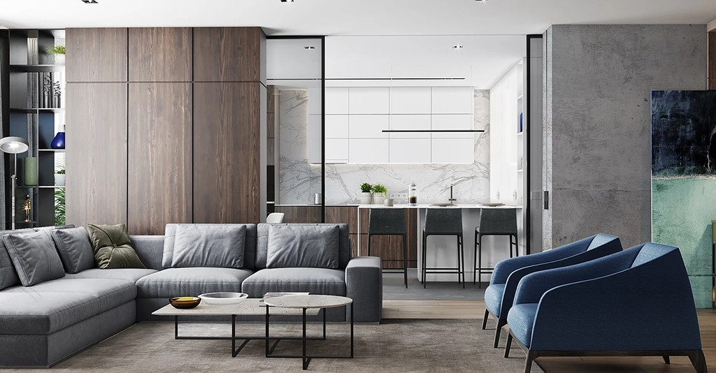 客厅沙发用简约的灰色布艺沙发,显得简单不耀眼,使整体风格更加和谐。旁边的两个蓝色单人小沙发,便是这经典配色中的亮色点缀。