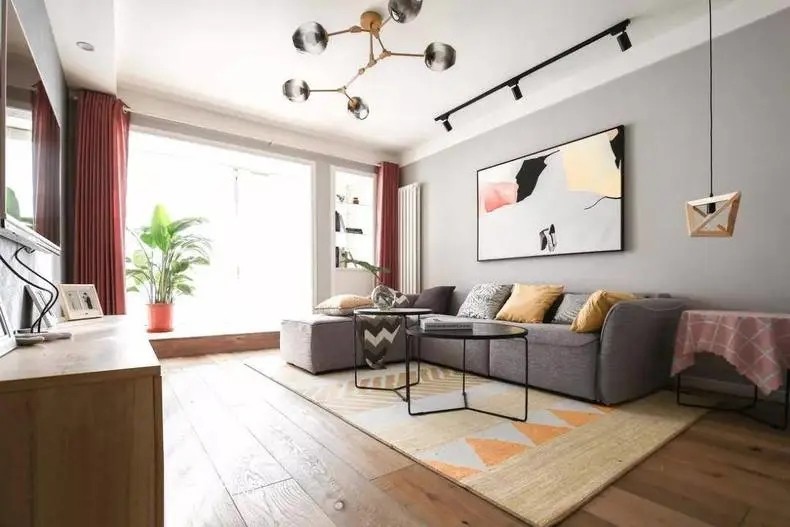 一张亮色几何地毯中和了灰色转角沙发带来的低调感,造型别致的茶几和金属吊灯成为空间中的亮点,整体效果简约而不失格调。