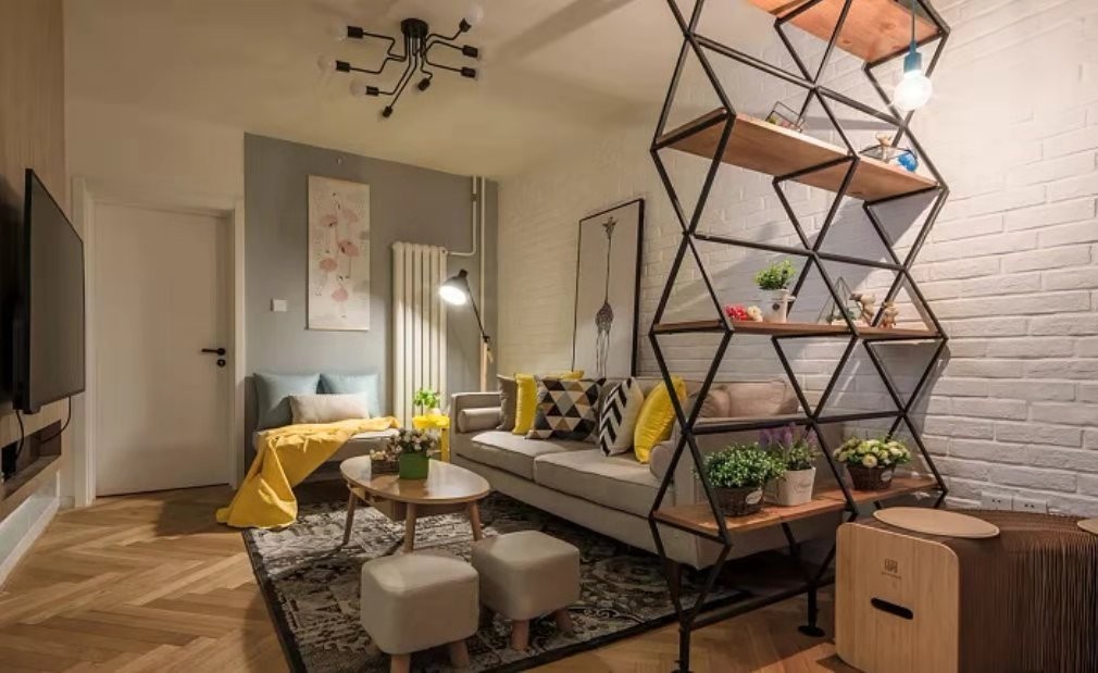 成品的铁艺展架把入户与客厅分隔成两个区域,地面的鱼骨拼接地板贯穿整个客厅与餐厅过道,让空间视觉更加统一更显宽敞