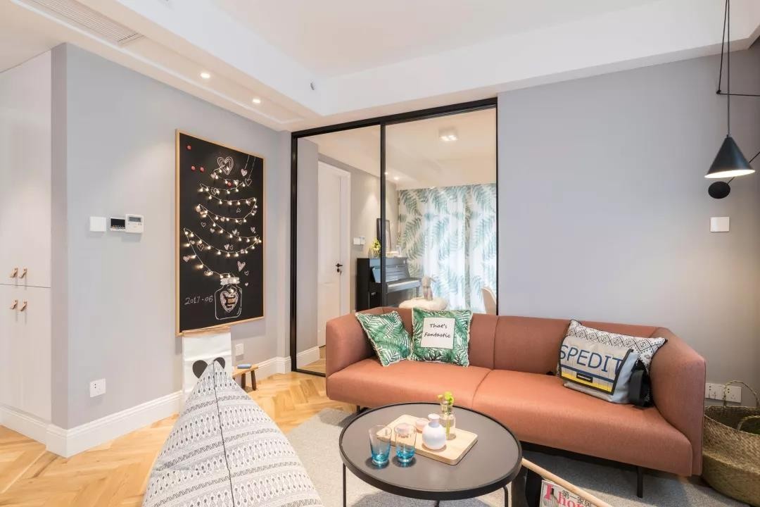 客厅的整个色调分为三个部分,一是墙面的浅灰色,低调中又带点清新,二是吊灯的纯白色,干净大气,三是地板上的木色,三个颜色形成三个角块,地板砖的拼接方式拉伸了客厅的纵深感。