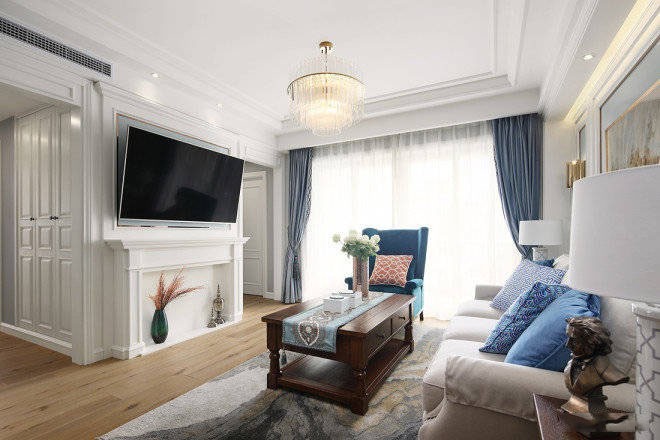 电视墙背后做了一组衣柜,增加了储物空间,客厅和餐厅也在视觉上划为相对整齐的格局,以浅色调为主,局部点缀搭配蓝色,营造大气活泼的格调