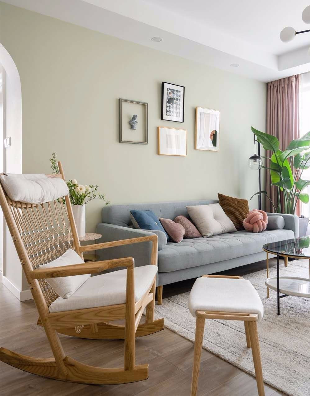 客厅的全貌,整体看起来春意盎然,有种春天的到来了的感觉