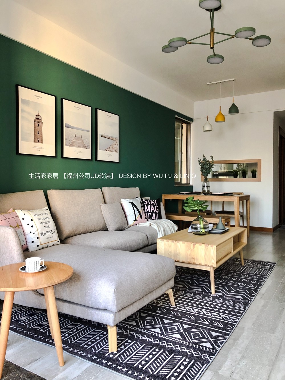 餐厅在客厅的一侧,绿色的背景墙,木制的餐桌和餐椅,一股大自然的气息铺面而来。