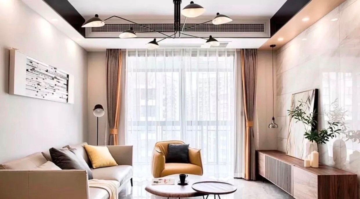 电视背景墙采用仿爵士白大理石瓷砖,配合深色木质电视柜和银黑色吊灯。