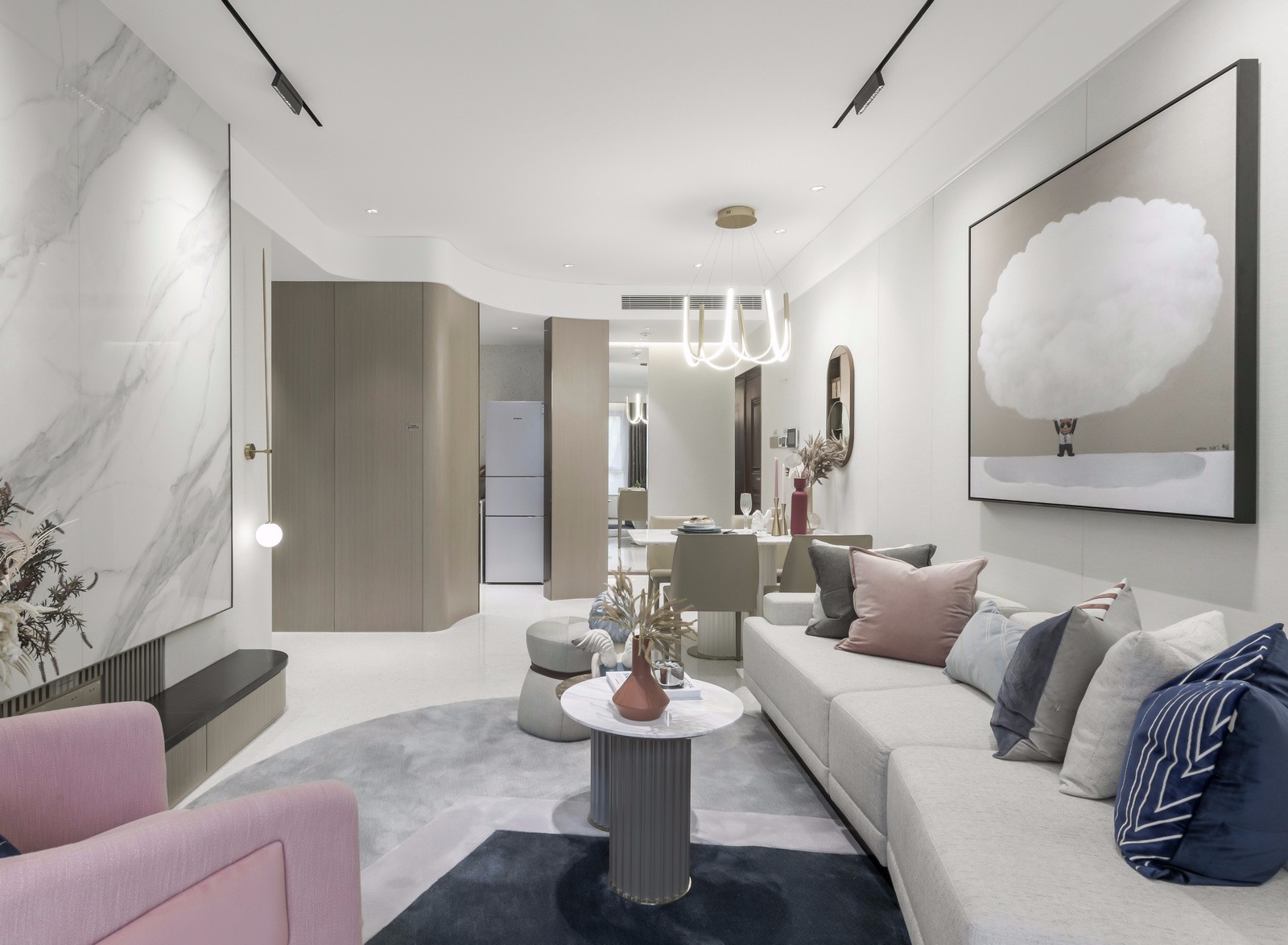客厅空间,希望打造的雅调云意,在控制整体淡淡的灰白色调的同时,跳跃一些清新的粉红,墨蓝,诠释云居的空间主题和概念,希望未来家居空间更清新,舒适。