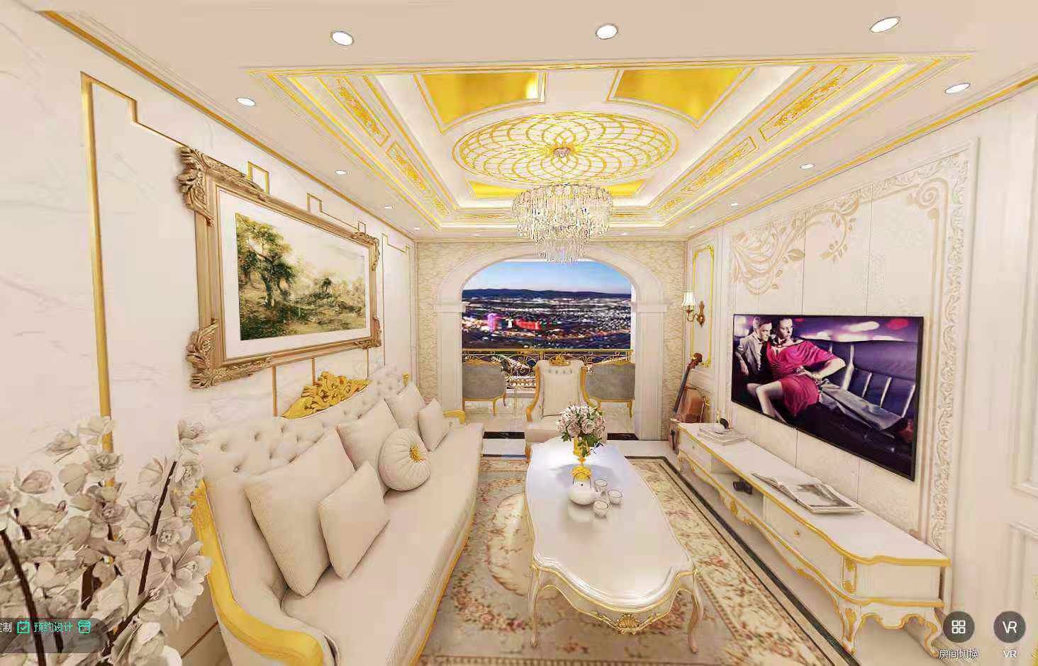 整体以白色为主,再加金色画框、桌椅边条,和金色吊顶,恰到好处的修饰,并没有庸俗之感