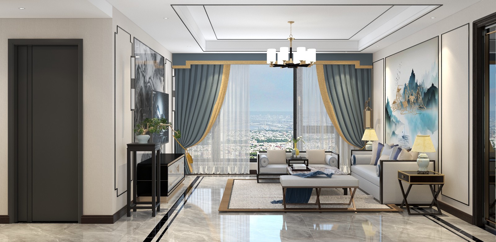 客厅背景墙用不锈钢线条加中式元素组成,既有了对称美,又不会显得老气。