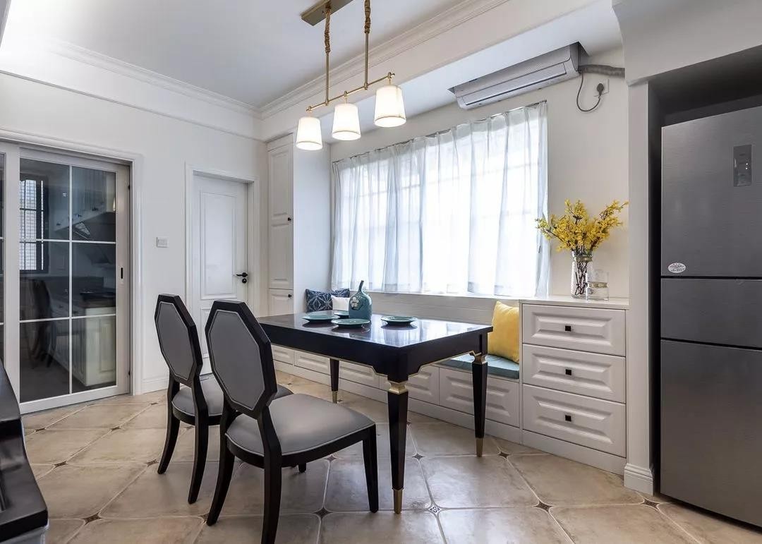 餐厅靠近客厅,紧挨着厨房,是全家公共区域的核心。深胡桃木色餐桌摆上餐具便是人间烟火气,摆上花艺、书本及家中***的绘板亦是满室书香及温情。 靠近窗户位置设计一整排卡座,高低错层的处理,满足小空间餐边柜的需求。