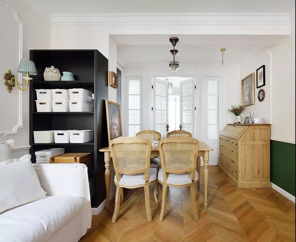 复古调的餐桌椅组合加以侧边黑色展示柜的不俗质感使空间稳重而华丽