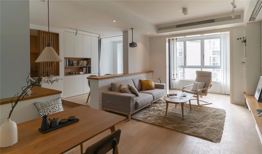 矮墙以白色文化砖打造,木质台面延伸至旁边的高墙,可以摆放装饰画与小摆件。灰色布艺沙发靠墙而置,简约又舒适。
