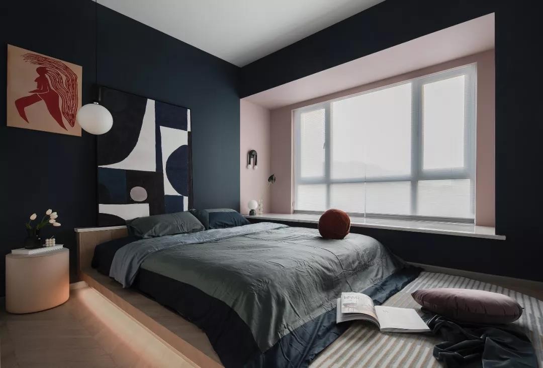 主卧空间还挺宽敞,而且大大的窗子光线超好,深色墙面也就不会给人压抑的感觉。地台床下还有灯带,光线柔和,缓和一下深色给人冷硬的感觉。