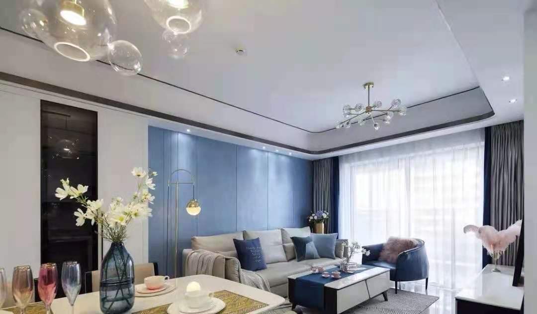 客厅以白色为主,搭配蓝色。给你一个温馨靓丽的家。