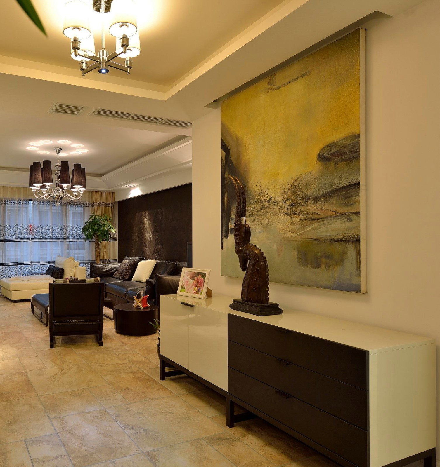 高端大气在沉稳中带来实实在在的温馨。床头的装饰摆画,给室内增添一股文艺气息。