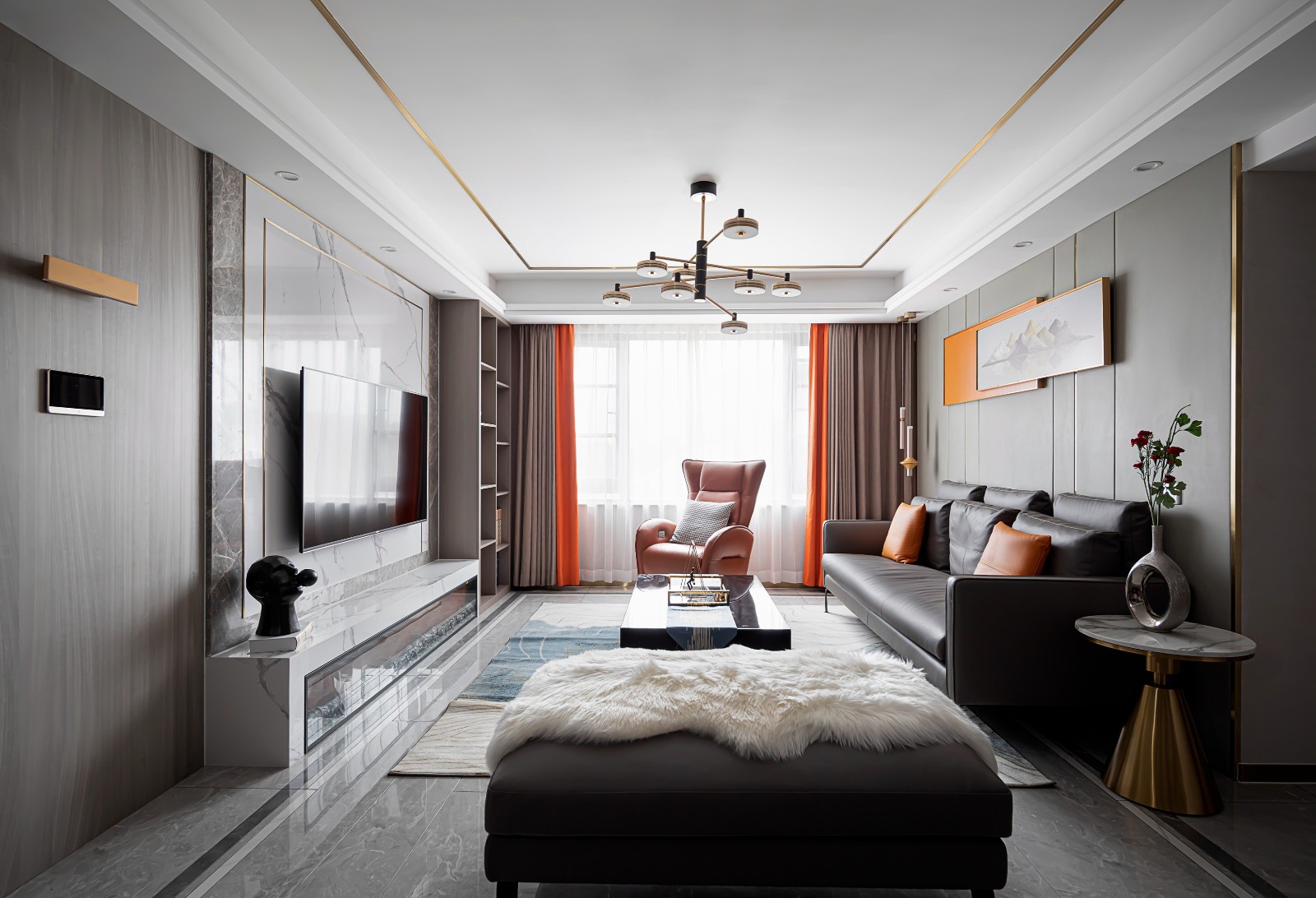 客厅整体灰调,以亮橙色作为软装主配色。