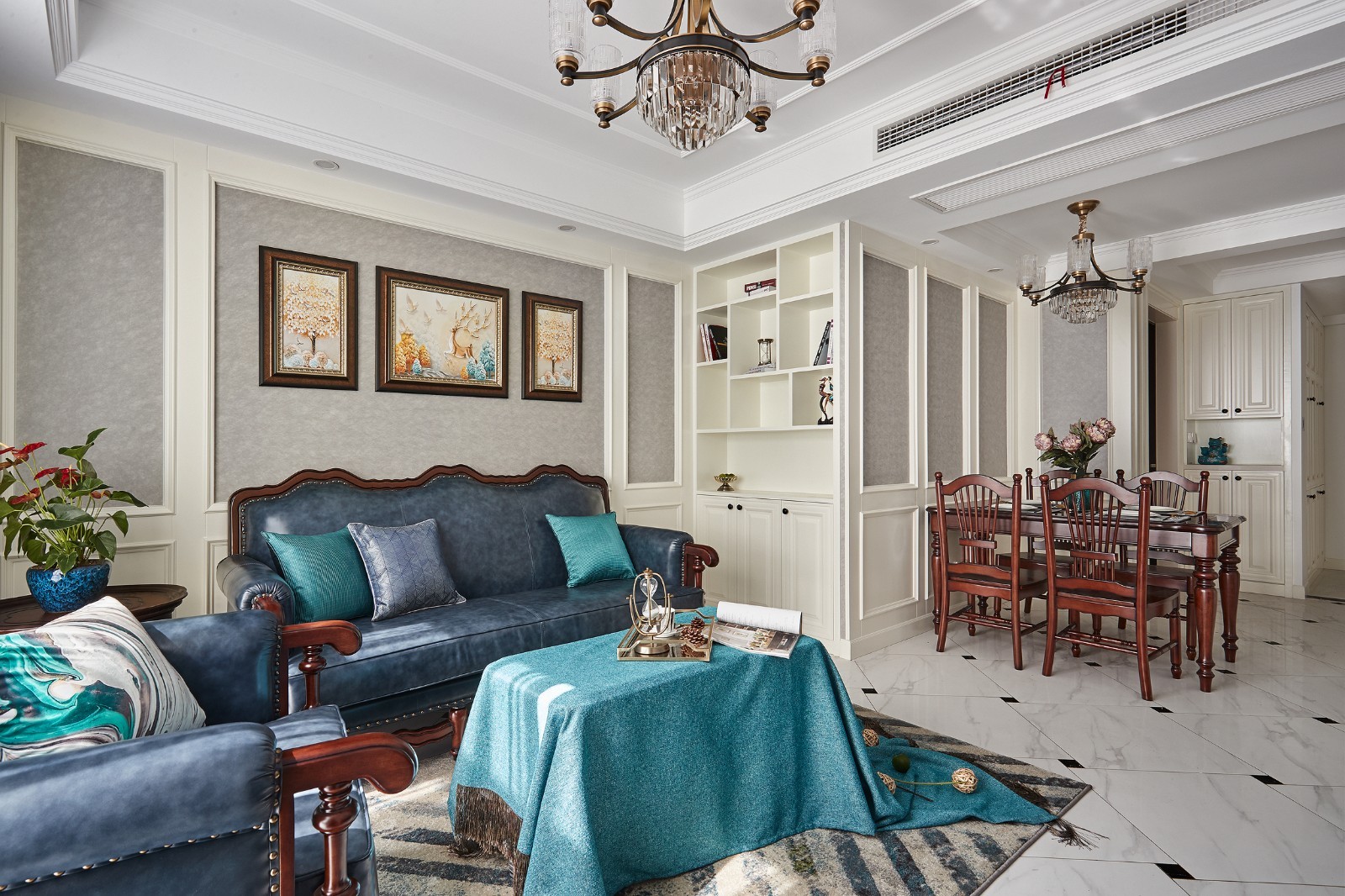 客厅空间简洁明快,复古孔雀蓝沙发搭配同色窗帘,带给人一种浓烈的历史气息。