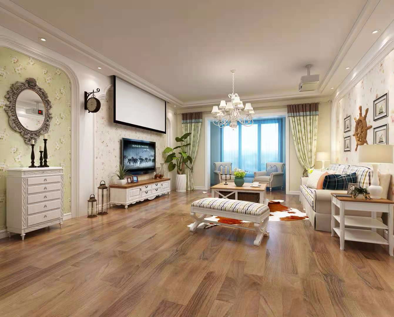 中色的地板 弧形造浅,暖色的碎花的壁纸,让人放松而温馨