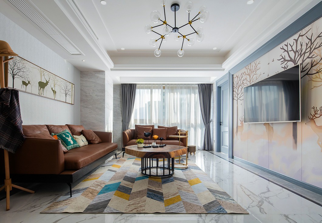 圆形的大茶桌是客厅的亮点。大自然馈赠木材的纹理和墙面现代大理石的对比。