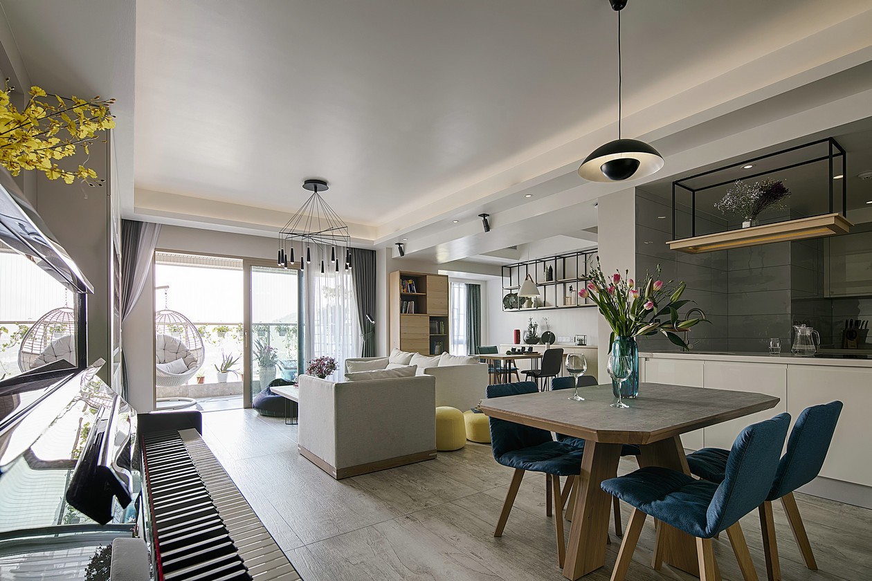客厅整个色彩搭配不超过三种,而且设计师这边也是选用了纯色为主色调搭配