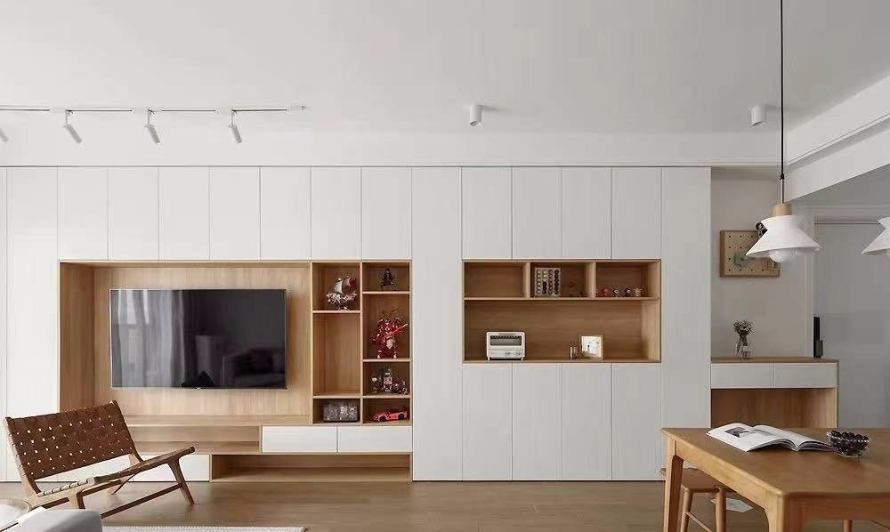 客厅电视柜跟餐边柜做成整体,木色跟白色的配比很协调
