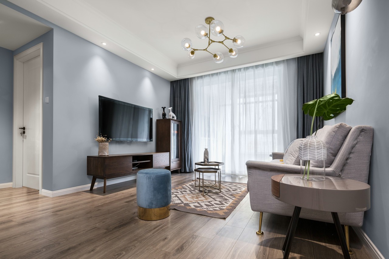 本案户型不大,根据业主的需求和预算最终确定为北欧风格。在功能设计上力求实用,简洁;色彩上以清新为主导,以蓝色,咖色作基础色调,软装做提升,最终效果清新恬适。