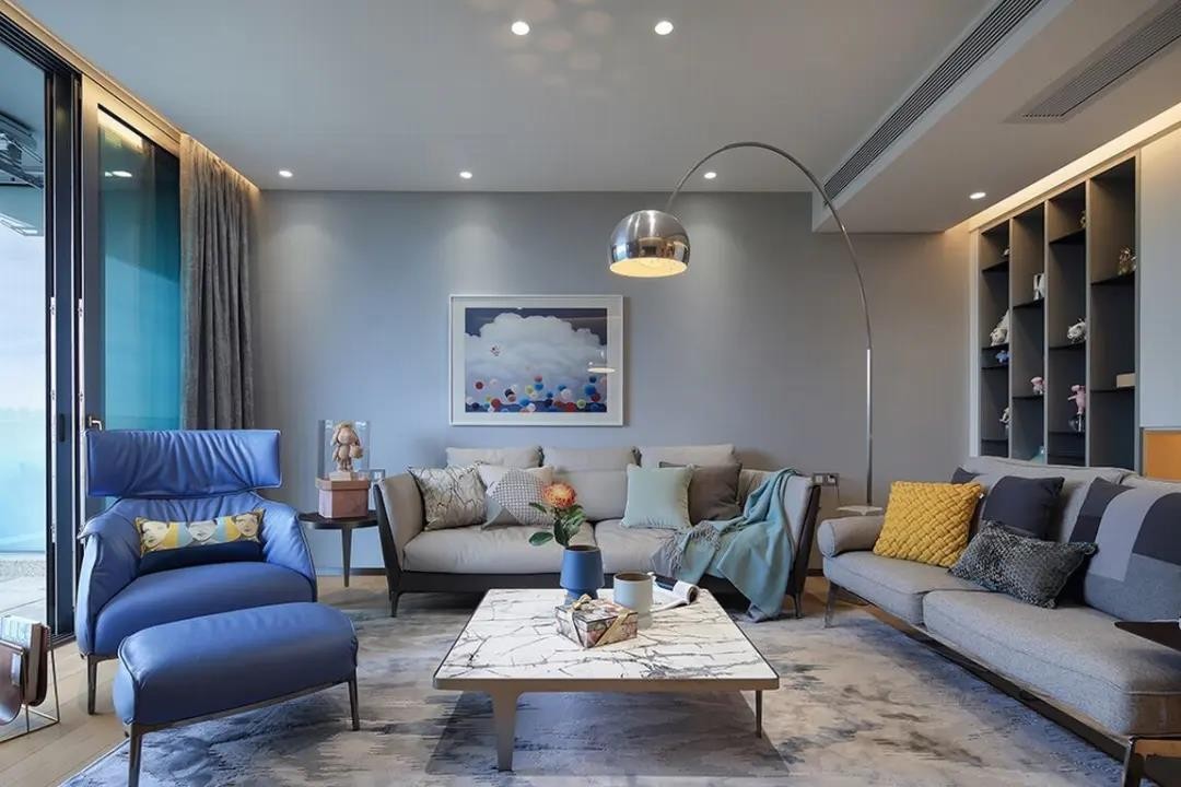 灰色的沙发墙挂上一幅放飞气球的装饰画,布置布置沙发,还有儒雅的地毯,蓝色的单人沙发椅,也让空间显得格外的自然舒适。