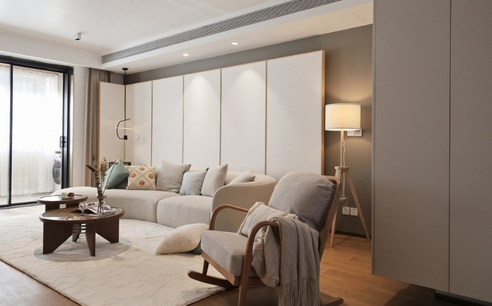 客厅为了保证吊顶的统一性,特意定制的加长出风口。整体色调多以灰色+白色进行构造,搭配原木色家具,加入充满活力的绿色植物,绿色靠包来进行点缀,打造整体客厅清新自然的整体氛围感。