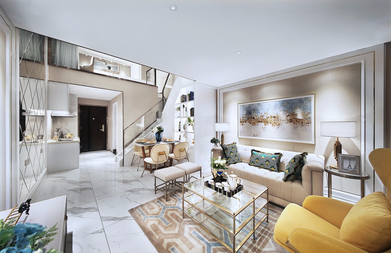 这是站在客厅往门口看的角度,这就可以看到设计中空厅的重要性,靠近最里的书客房室可以通过客厅和主卧采光,这样层高也有了变化,不会太压抑。