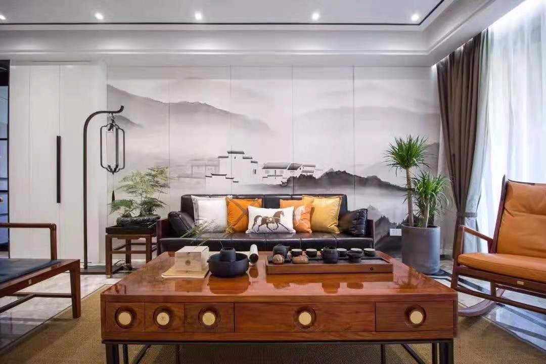 沙发墙选择了定制款水墨图案中式硬包,水墨画意境悠远,凸显中式气韵